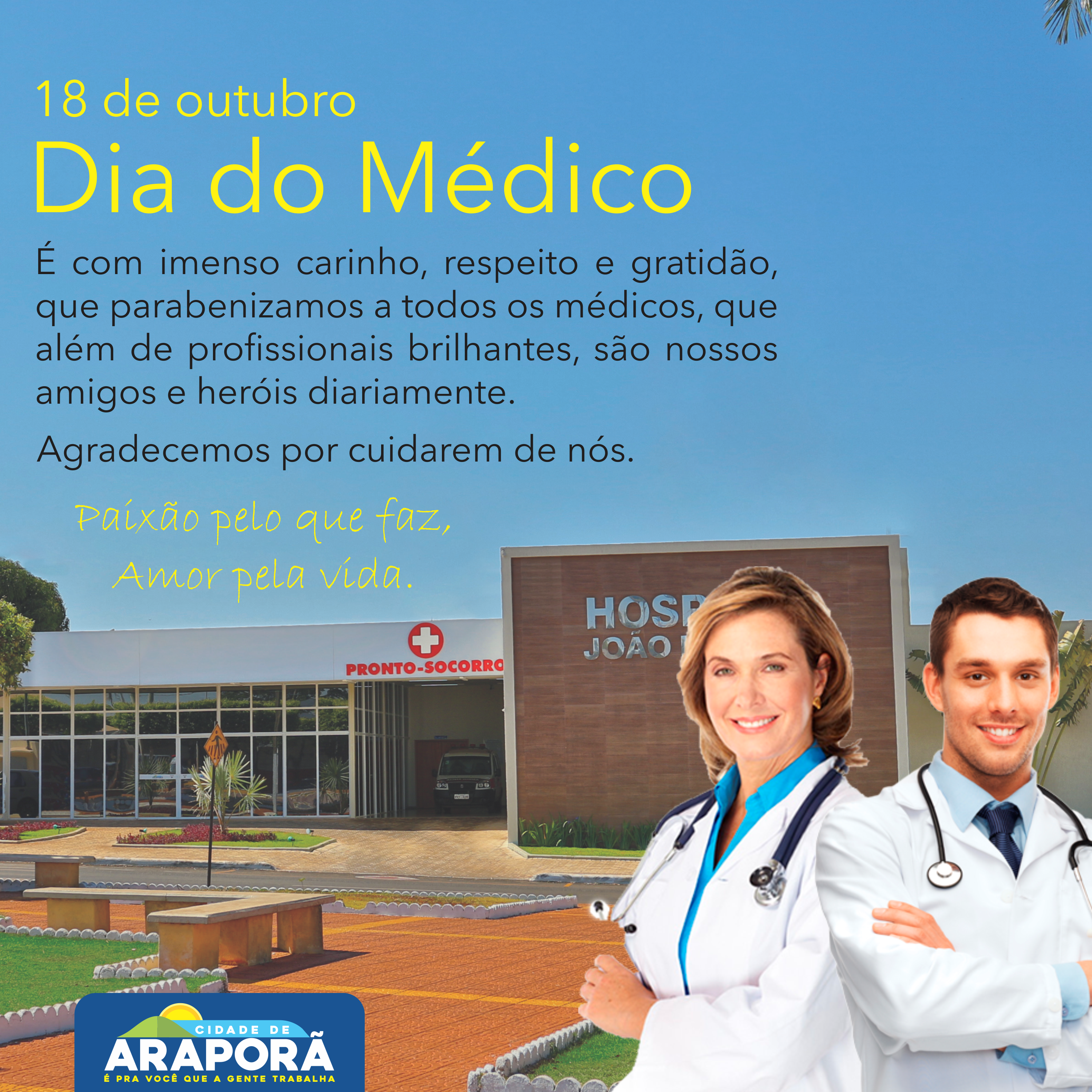 18 de outubro, Dia do Médico. Mas se preferir pode chamar de dia da tranquilidade, dia da amizade, dia da atenção, dia da responsabilidade, dia do profissionalismo, dia da dedicação ou dia da vida. O agradecimento e reconhecimento à todos os profissionais do município de Araporã.