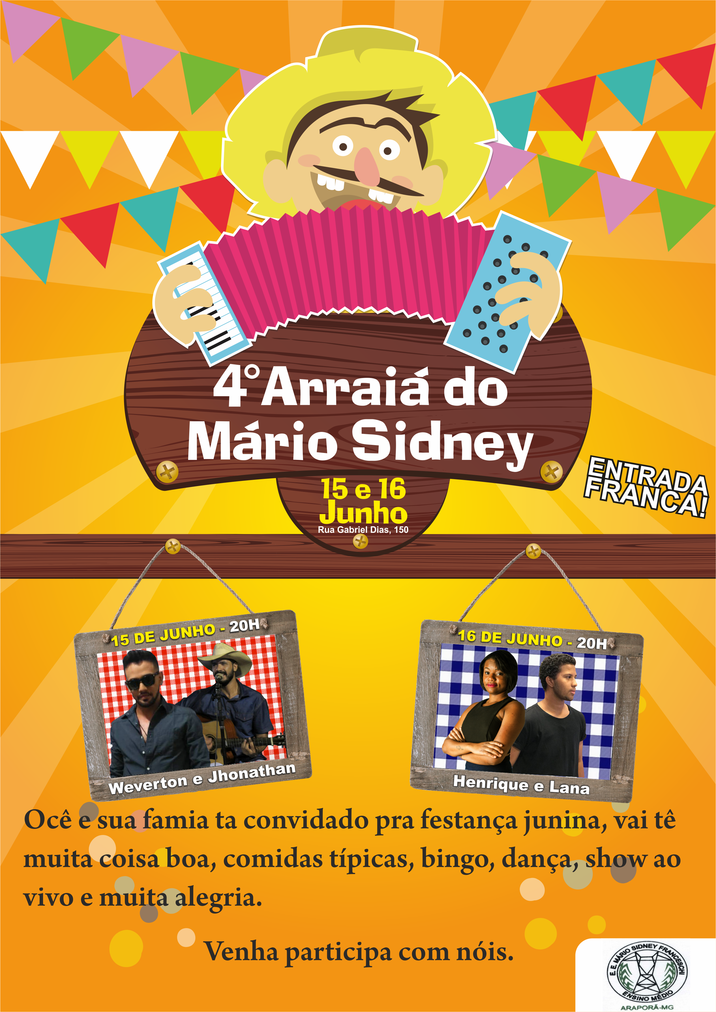 A Escola Estadual Mário Sidney Franceschi convida à toda comunidade para o “4° Arraiá do Mário Sidney”. O evento será realizado nos dias 15 e 16 de junho, à partir das 19:00h na sede da escola na Rua Gabriel Dias, 150, centro (em frente ao Cemei Erotildes). O arraiá terá muita quadrilha, comida típica, bingo e música ao vivo com a dupla Weverton e Jhonatan no dia 15 e Henrique e Lana no dia 16.