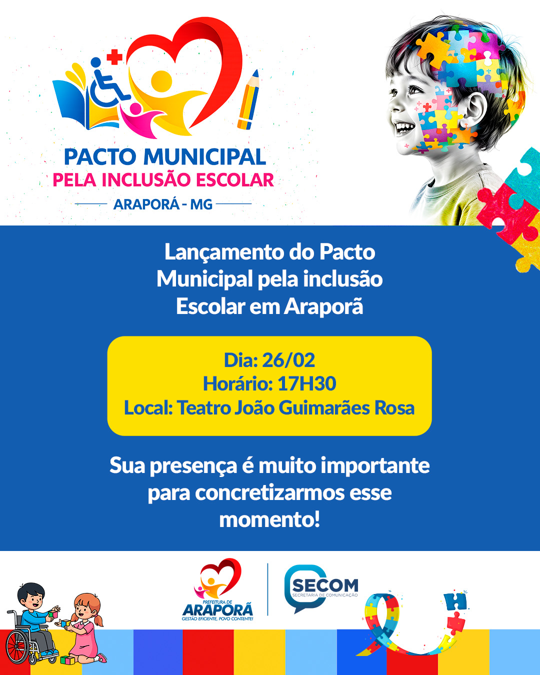 A Prefeitura de Araporã reforça que a participação da comunidade é fundamental para a consolidação desse compromisso coletivo com a inclusão e convida todos a participarem desse momento especial.