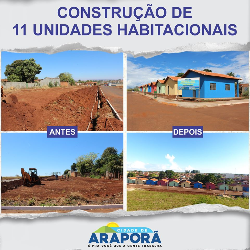 A Prefeitura de Araporã investiu mais de R$ 500 mil na construção de 11 Unidades Habitacionais, no setor Zequinha Cachoeira. As unidades fazem parte do Programa Construindo Araporã lançado pela atual gestão, onde totalizou a aplicação de recursos próprios da ordem de R$ 581.022, 64, oriundos do Fundo Municipal de Habitação.