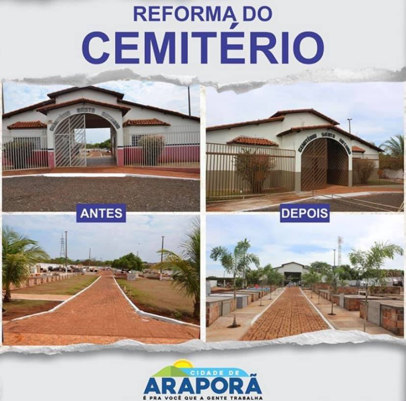 A reforma do Cemitério Municipal garante mais conforto e segurança às famílias araporenses, no momento de sepultamento e visitas. O local passou por uma grande reestruturação, onde foram realizadas a construção de um novo estacionamento, reforma da capela e sala da administração, calçadas, troca de telhado, pintura e arborização. Toda a reforma contou com dinheiro do município.