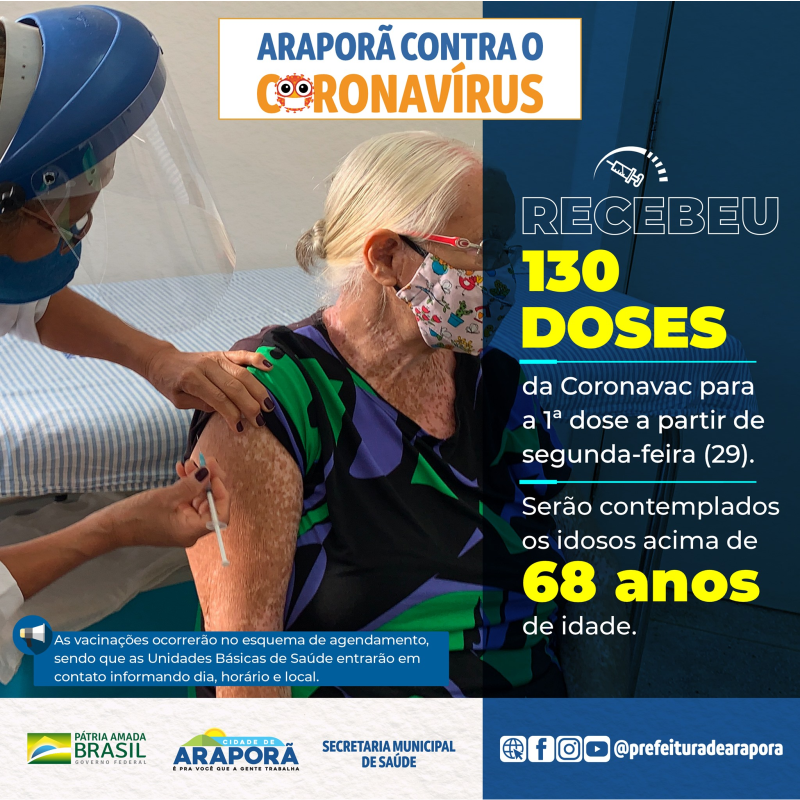 A partir de segunda-feira, 29, essas doses serão destinadas para a aplicação da 1ª dose em idosos acima de 68 anos. Vale lembrar que a vacinação ocorrerá no esquema de agendamento, sendo que as Unidades Básicas de Saúde entrarão em contato informando dia, horário e local.