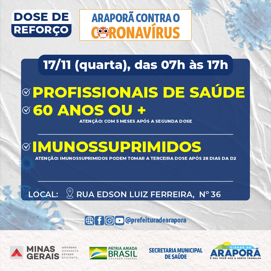 Araporã avança na vacinação de reforço contra a Covid-19, e informa aos grupos que a vacinação já está disponível na sala de vacinas do PSF 2, da seguinte forma: