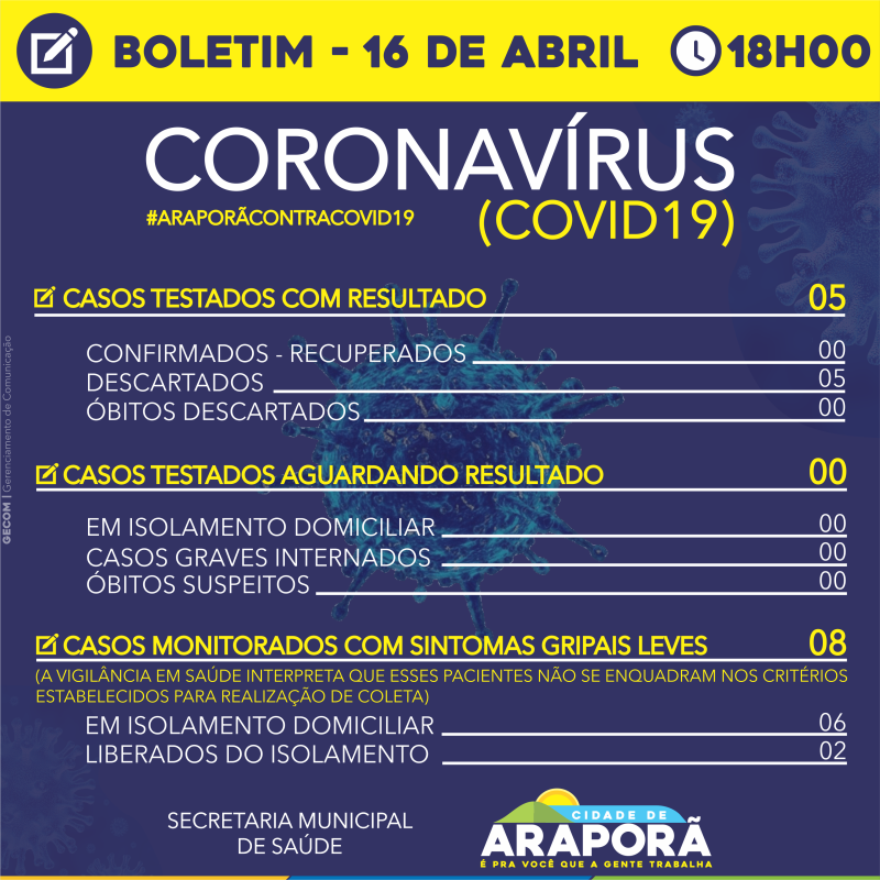 Confira atualização do boletim municipal desta quinta-feira (16/04).