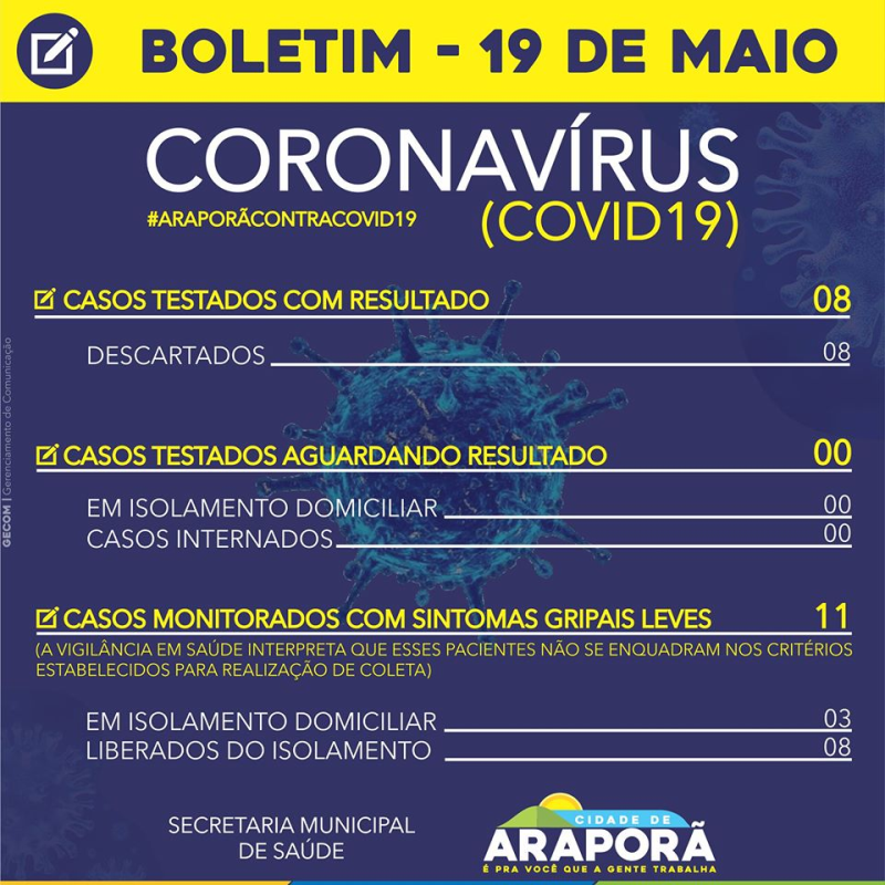 Confira atualização do boletim municipal desta terça-feira (19/05).