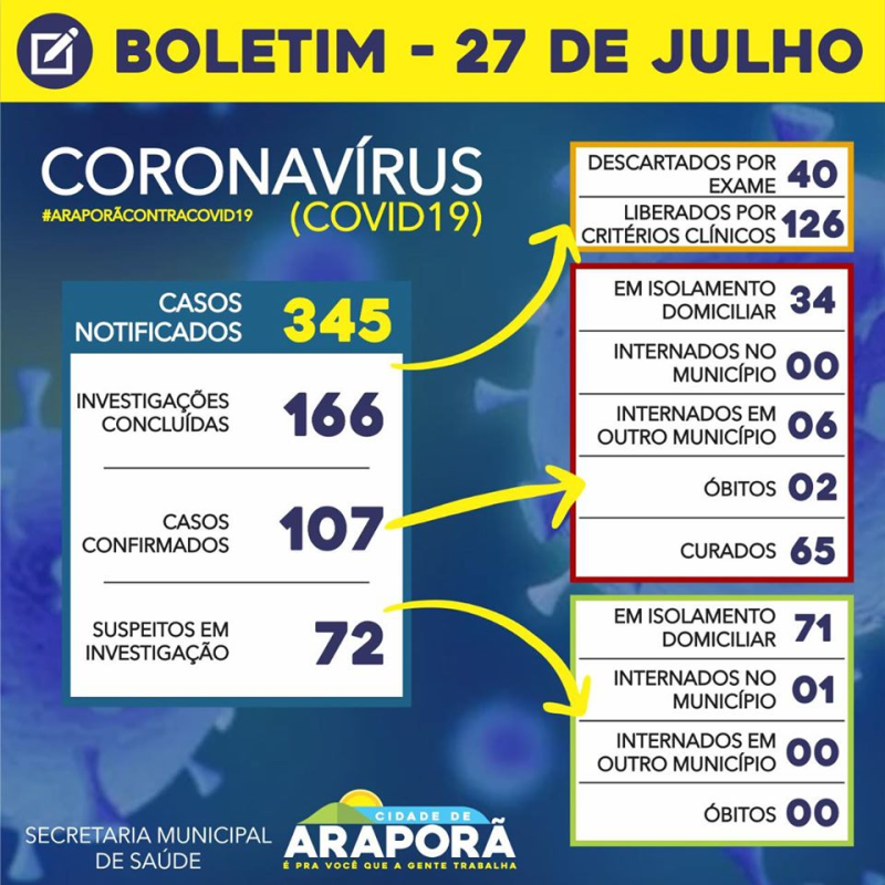 Confira atualização do boletim municipal desta segunda-feira (27/07).
