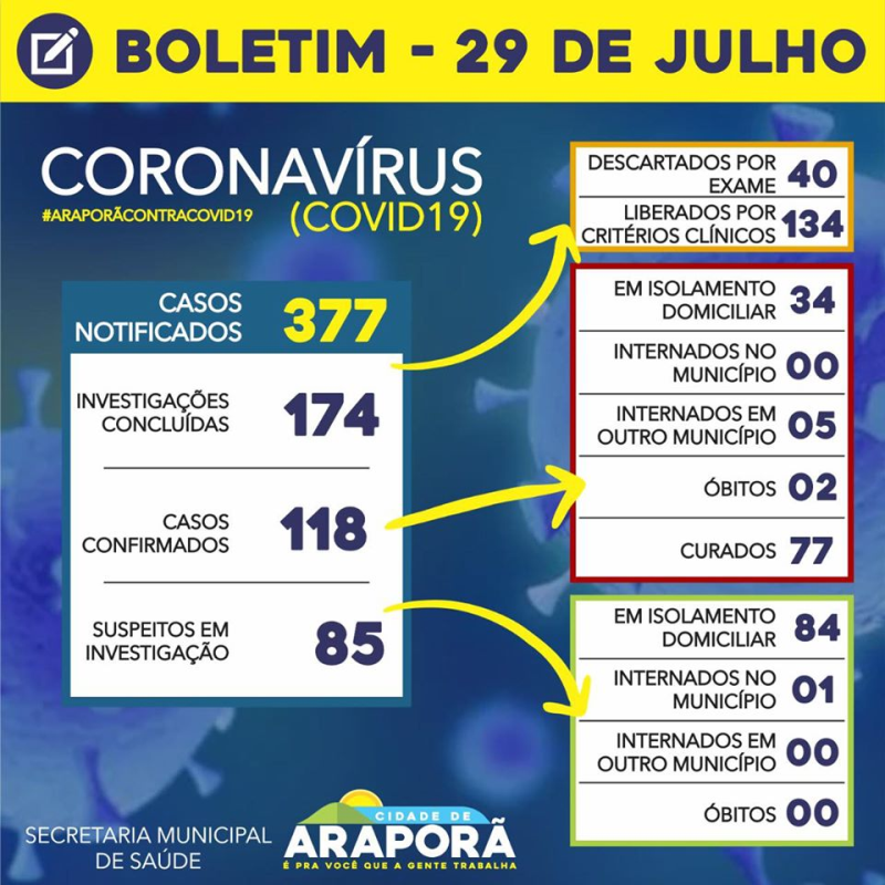Confira atualização do boletim municipal desta quarta-feira (29/07).