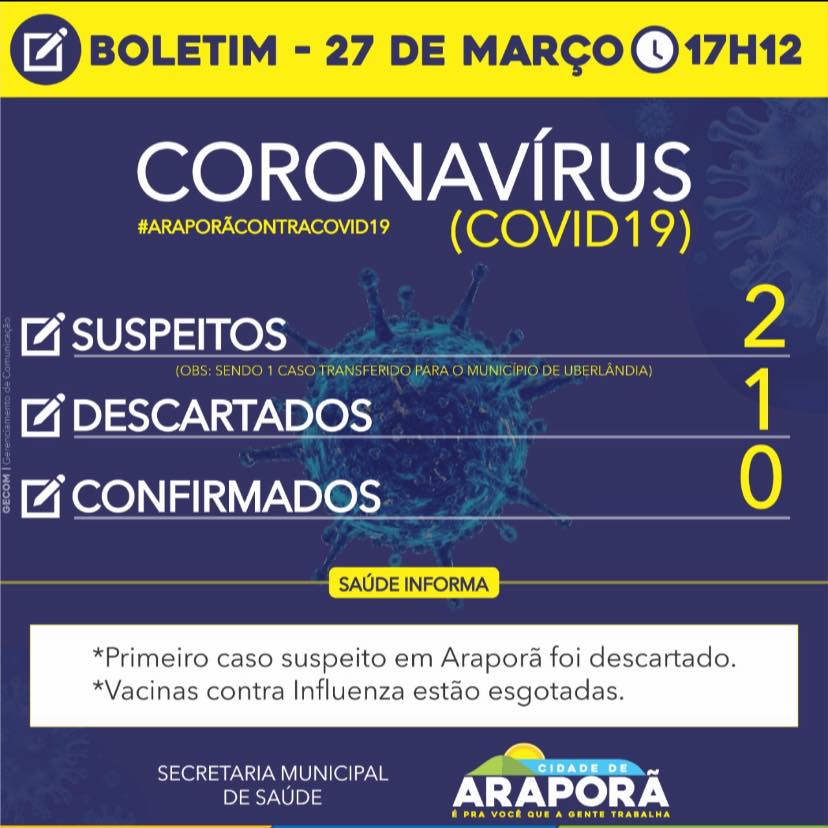 A cidade de Araporã, recebeu a pouco, o resultado do teste de um dos suspeitos de contaminação do Coronavírus. O caso está descartado, não sendo identificado como o vírus. Agora permanecem apenas dois suspeitos, aguardando resultado do exame já coletado.