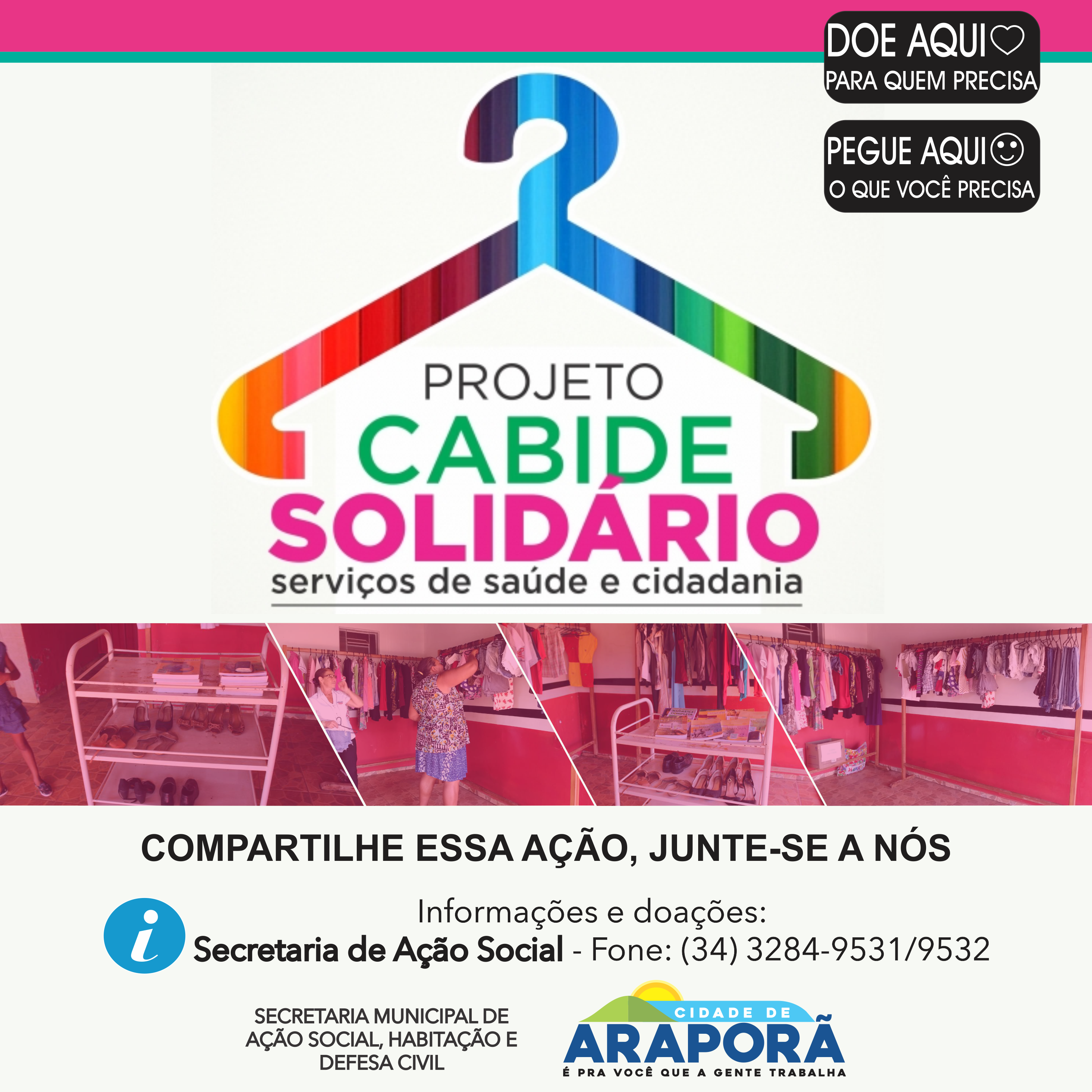 A Secretaria da Ação Social, Habitação e Defesa Civil de Araporã convida a população para conhecer o Cabide Solidário que foi criado para atender famílias de baixa renda com a doação de roupas, agasalhos, calçados, livros, dentre outros. A ação acontece diariamente na sede da Secretaria localizada na Rua Antônio Franceschi nº 70, no Bairro Alvorada, de segunda a sexta-feira, das 7h às 11h e das 13h às 17h.