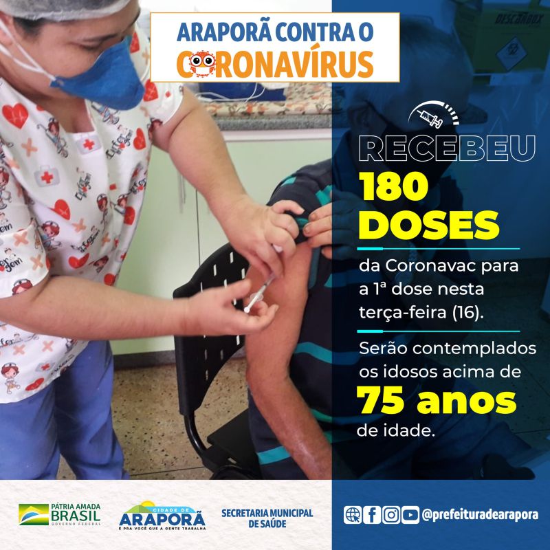 A cidade de Araporã, recebeu ontem (16), mais um lote de 180 vacinas contra a Covid-19 da Coronavac, conforme determinação de portaria e nota técnica da Secretaria Estadual de Saúde, que especificam indicadores para a distribuição de vacinas.