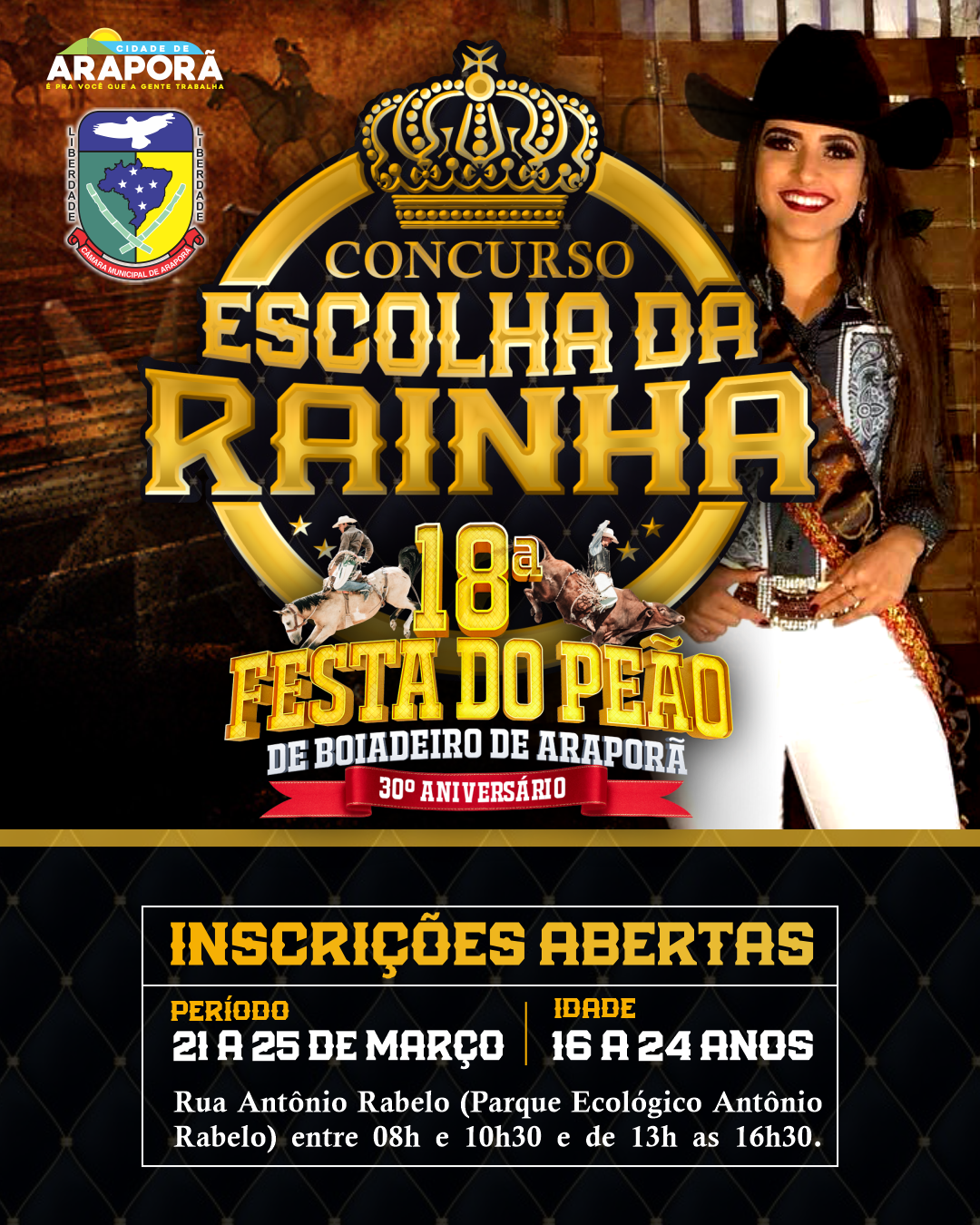 Estão abertas as inscrições para as araporenses de 16 a 24 anos que tem o sonho de se tornar rainha ou princesa da 18ª Festa do Peão de Boiadeiro de Araporã.