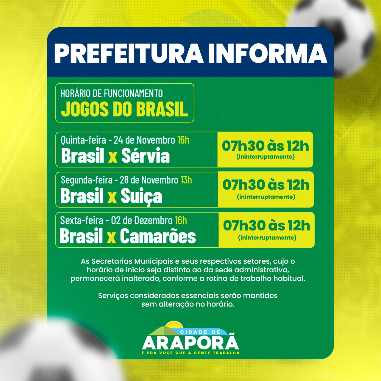 CONFIRA COMO FICA OS HORÁRIOS DE FUNCIONAMENTO DA PREFEITURA DURANTE OS PRIMEIROS JOGOS DO BRASIL NA COPA