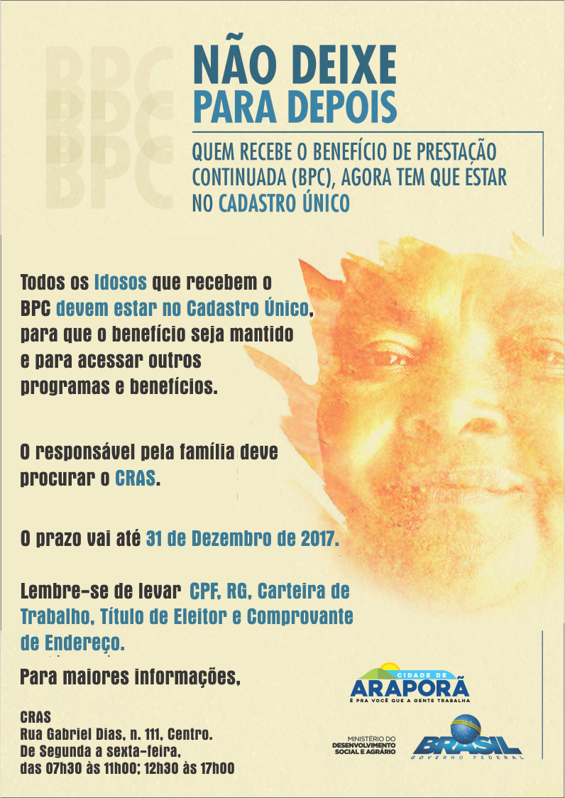 É importante destacar que se as pessoas idosas beneficiárias do BPC não estiverem inscritas no Cadastro Único até 31 de dezembro de 2017, e as pessoas com deficiência não realizarem o cadastramento até 31 de dezembro de 2018 poderão ter seu benefício suspenso.