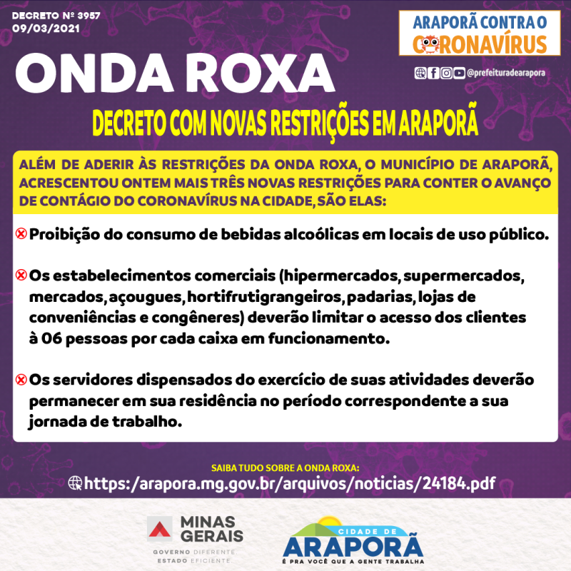 Além de aderir às restrições da onda roxa, o município de Araporã, acrescentou ontem mais três novas restrições para conter o avanço de contágio do Coronavírus na cidade, são elas: