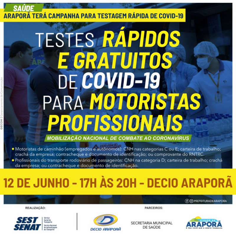 A campanha de realização de testes rápidos de COVID 19 realizada pelo SEST SENAT Itumbiara foi abraçada pela Prefeitura de Araporã e Secretaria da Saúde e a ação chegará ao município no dia 12 de junho. Nesse dia, entre 17h e 20h a estrutura estará disponível no Posto Décio Araporã - BR-153, Araporã-MG. A realização do teste obedece alguns critérios.