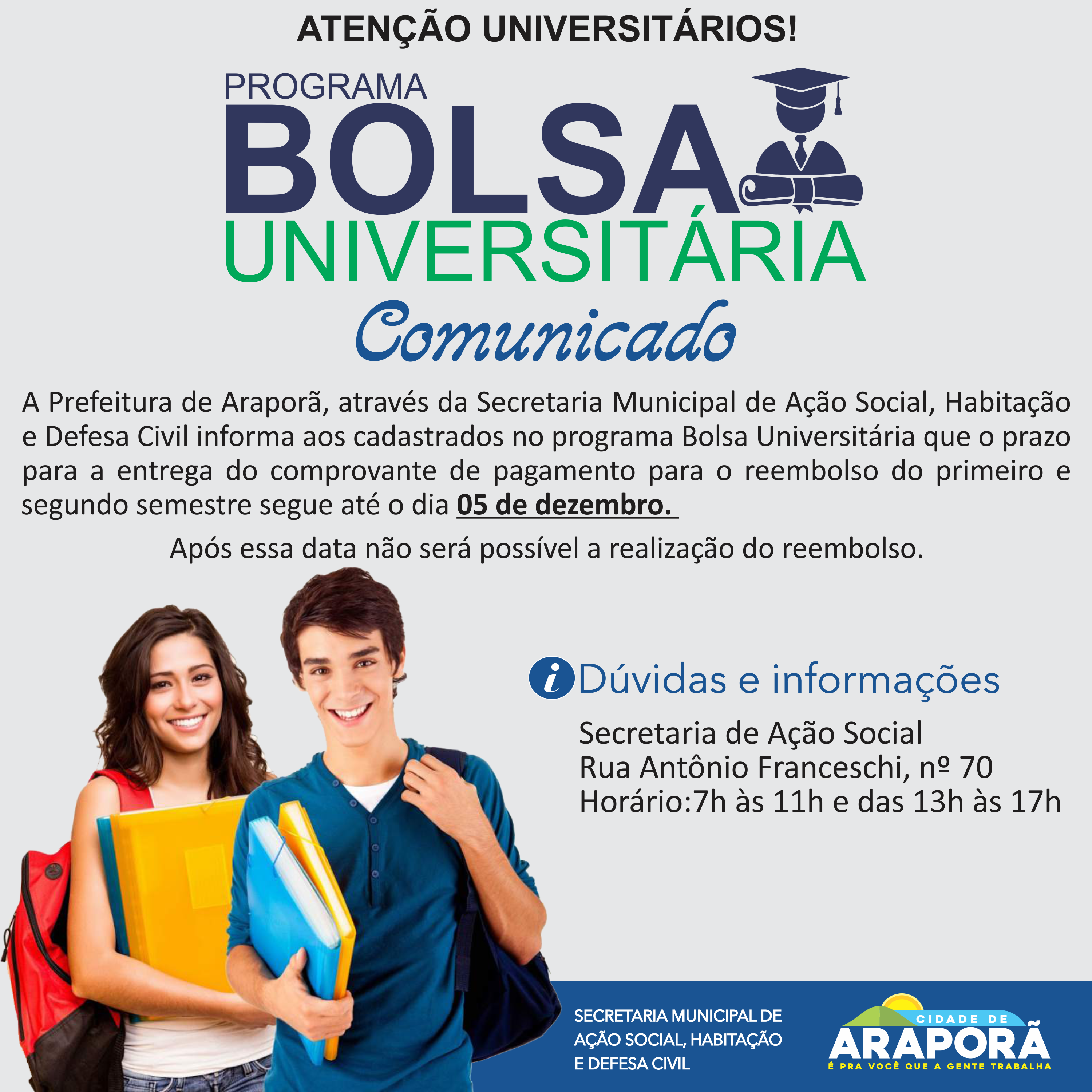 A Prefeitura de Araporã, através da Secretaria Municipal de Ação Social, Habitação e Defesa Civil informa aos cadastrados no programa Bolsa Universitária que o prazo para a entrega do comprovante de pagamento para o reembolso do primeiro e segundo semestre segue até o dia 05 de dezembro. Após essa data não será possível a realização do reembolso.