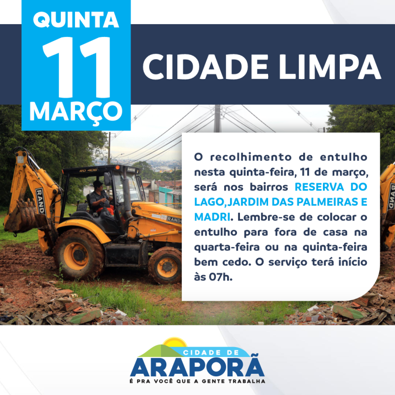 Nesta quinta-feira, 11, os trabalhos de recolhimento de entulho serão realizados nos bairros Reserva do Lago, Jardim das Palmeiras e Madri. O entulho deverá ser colocado em frente à residência no dia programado ou um dia antes. O serviço tem início às 07 horas.