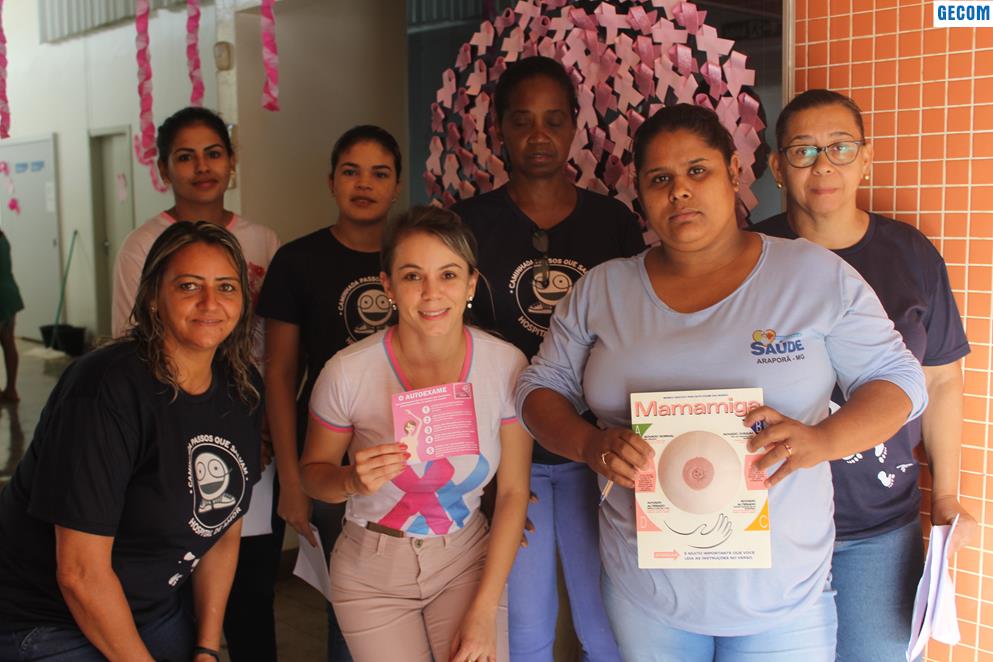 Na manhã dessa segunda-feira (15) aconteceu uma reunião com os pacientes na sala de espera dos PSFs 1 e 3 (Centro). Na pauta, a equipe da Secretaria da Saúde de Araporã formada pela enfermeira Ana Paula da Costa e agentes comunitárias de saúde, discutiu com as futuras mamães as atividades da campanha Outubro Rosa de prevenção e combate ao câncer. Dentre essas ações a equipe falou da importância da prevenção do câncer de mama. O autoexame das mamas pode ser feito por qualquer mulher e é de fundamental importância para detectar alterações como nódulos e caroços. Aproximadamente 80% dos tumores são descobertos pela própria mulher ao apalpar as mamas.