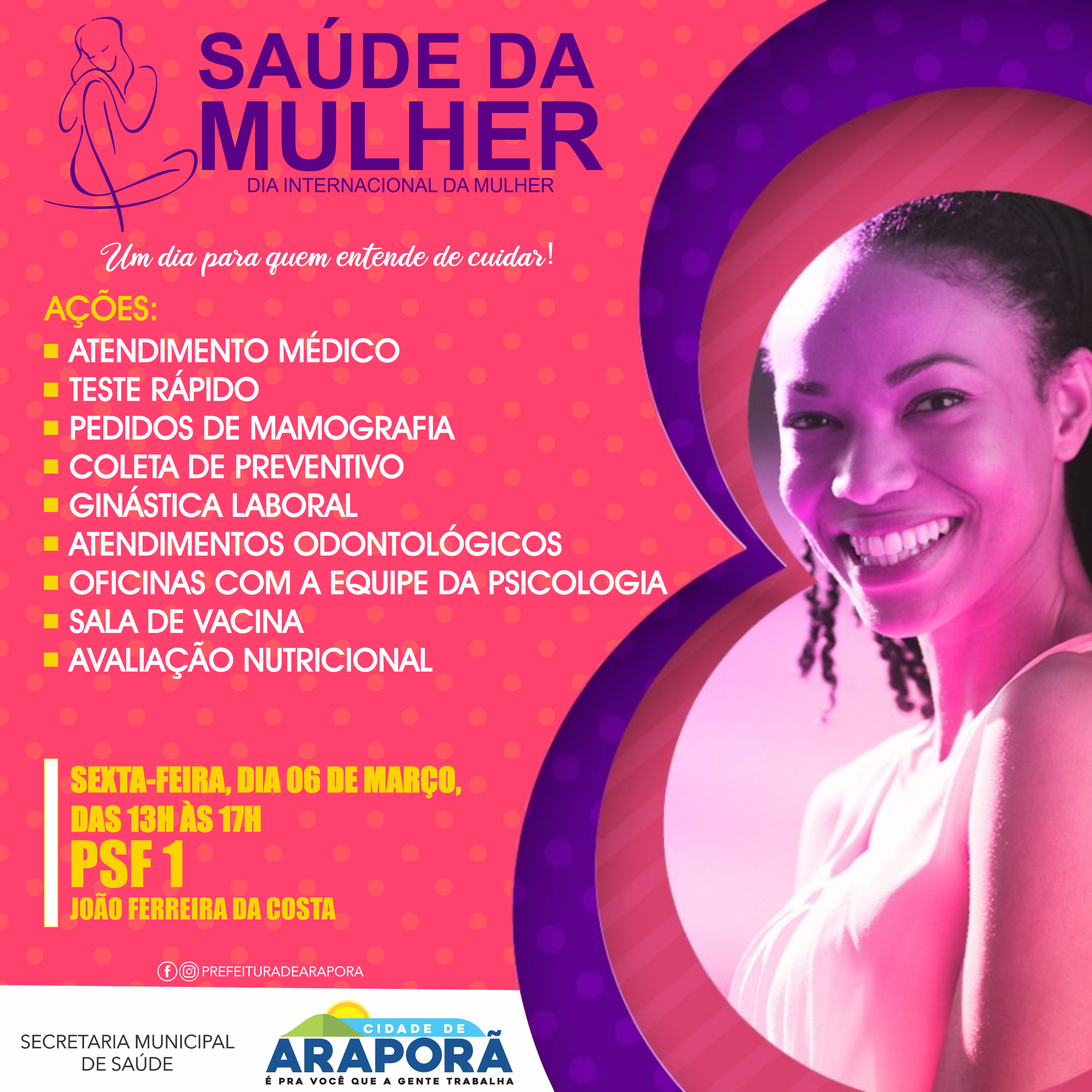 No mês delas, diversas ações foram preparadas, dentre as programações está organizado o dia da Saúde da Mulher. O evento é uma realização da Prefeitura em parceria com a Secretaria de Saúde, e acontece na tarde desta sexta-feira, no PSF 1 João Ferreira da Costa, entre 13 e 17 horas.