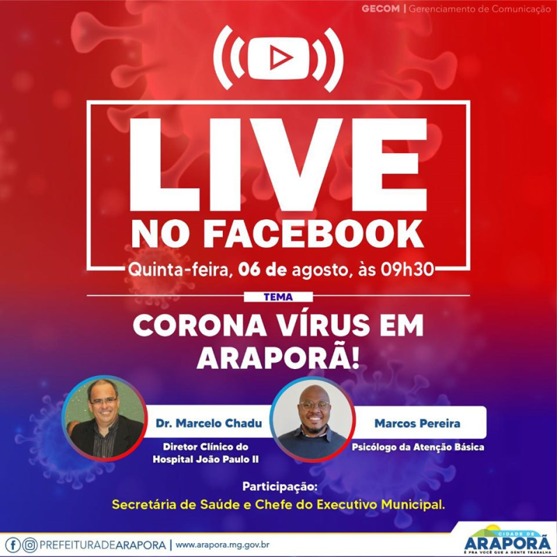Os cidadãos araporenses terão nesta quinta-feira, a partir das 09h:30min, uma live com transmissão ao vivo pelo Facebook, com o tema “Coronavírus em Araporã”. O bate-papo virtual, oferecido pela Secretaria de Saúde, será conduzido pelo médico, Marcelo Chadu (Diretor Clínico do HJPII), Marcos Pereira (Psicólogo da Atenção Básica em Saúde), além da Secretária de Saúde e da Chefe do Executivo Municipal.