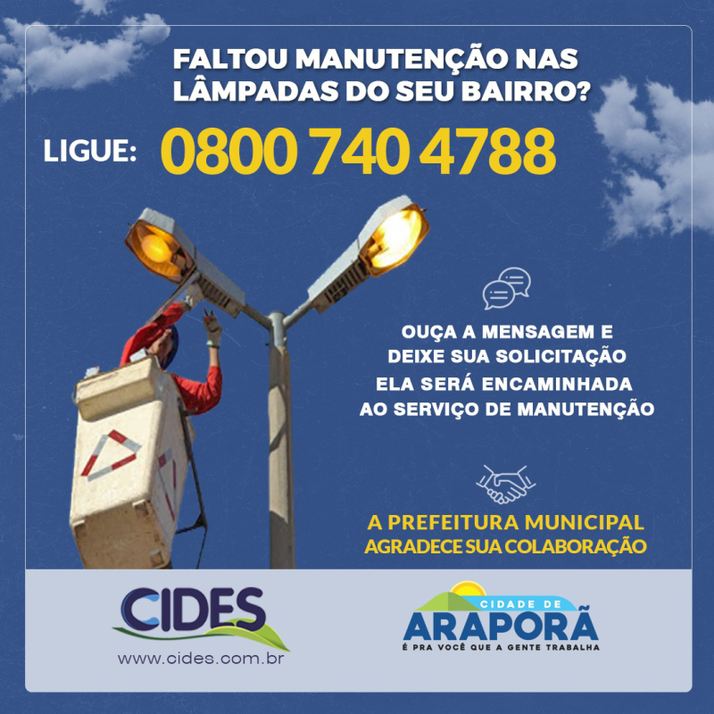 A Secretaria de Obras, Infraestrutura e Serviços Urbanos de Araporã, informa que a partir desta terça-feira (14) a população deverá utilizar o telefone 0800 740 4788 para solicitar serviços de manutenção em iluminação pública. Quando o solicitante entrar em contato com o CIDES, ele ouvirá uma mensagem e em seguida deverá deixar sua solicitação, onde a mesma será encaminhada ao serviço de manutenção.