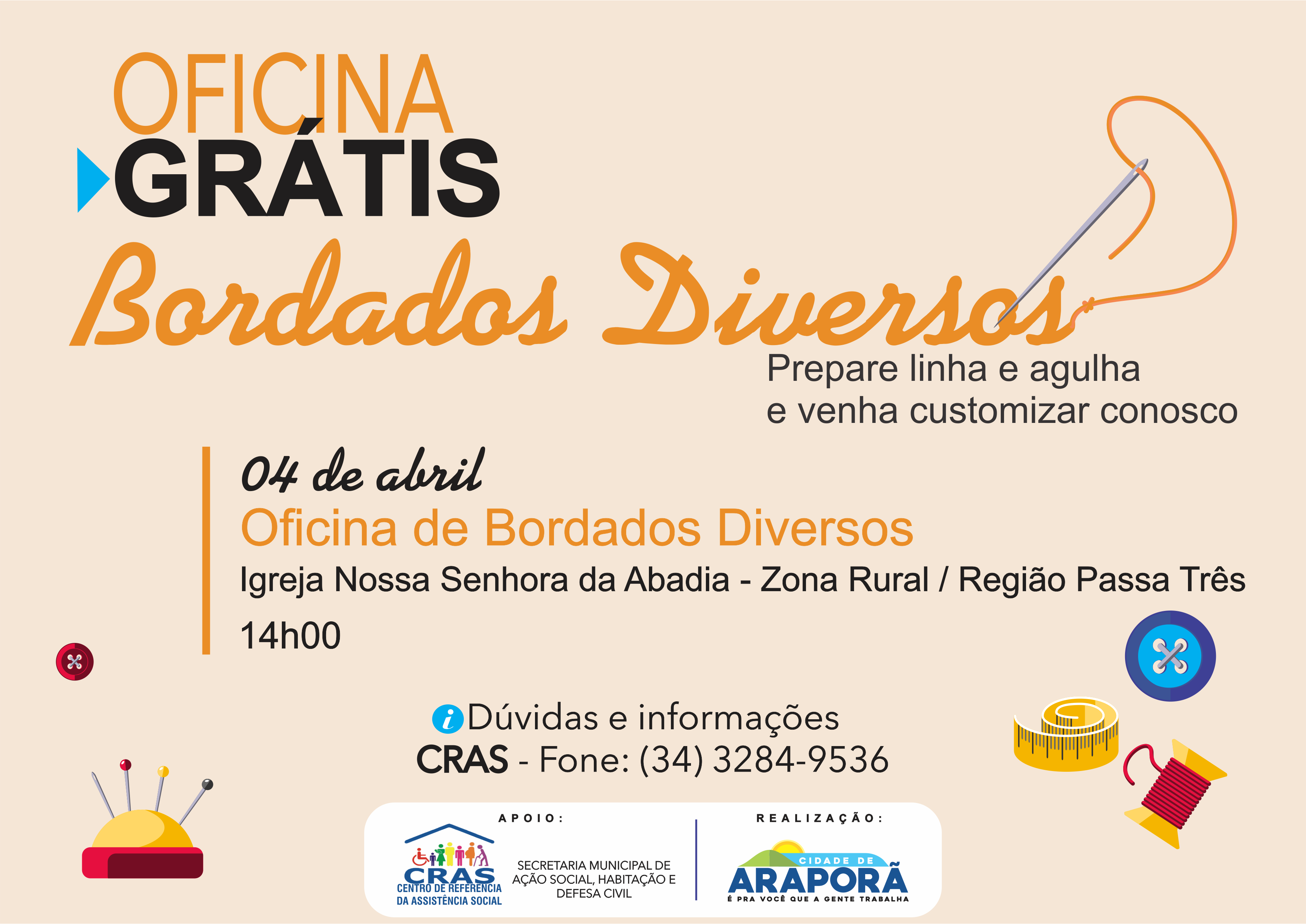 A Prefeitura de Araporã estará promovendo amanhã (04) na região do Passa Três, oficina de bordados diversos para pessoas da região. A iniciativa é da Secretaria Municipal de Ação Social, Habitação e Defesa Civil que busca com a medida qualificar pessoas da zona rural para incrementar a renda familiar.