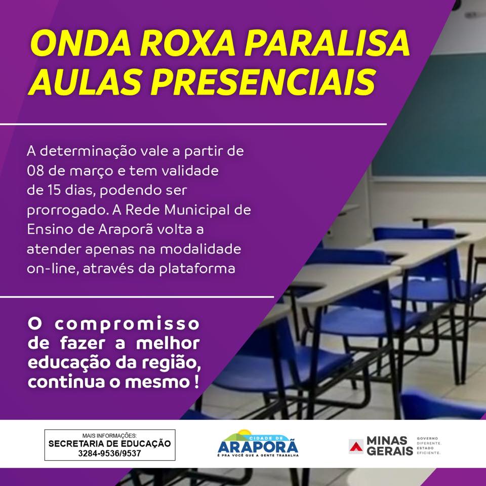 O município respeitando a hierarquia de poderes, acatou a nova deliberação e a partir de 08 de março, segunda-feira, a Rede Municipal de Ensino de Araporã permanecerá apenas com aulas online na plataforma, pelo período inicial de 15 dias, podendo ser prorrogado.