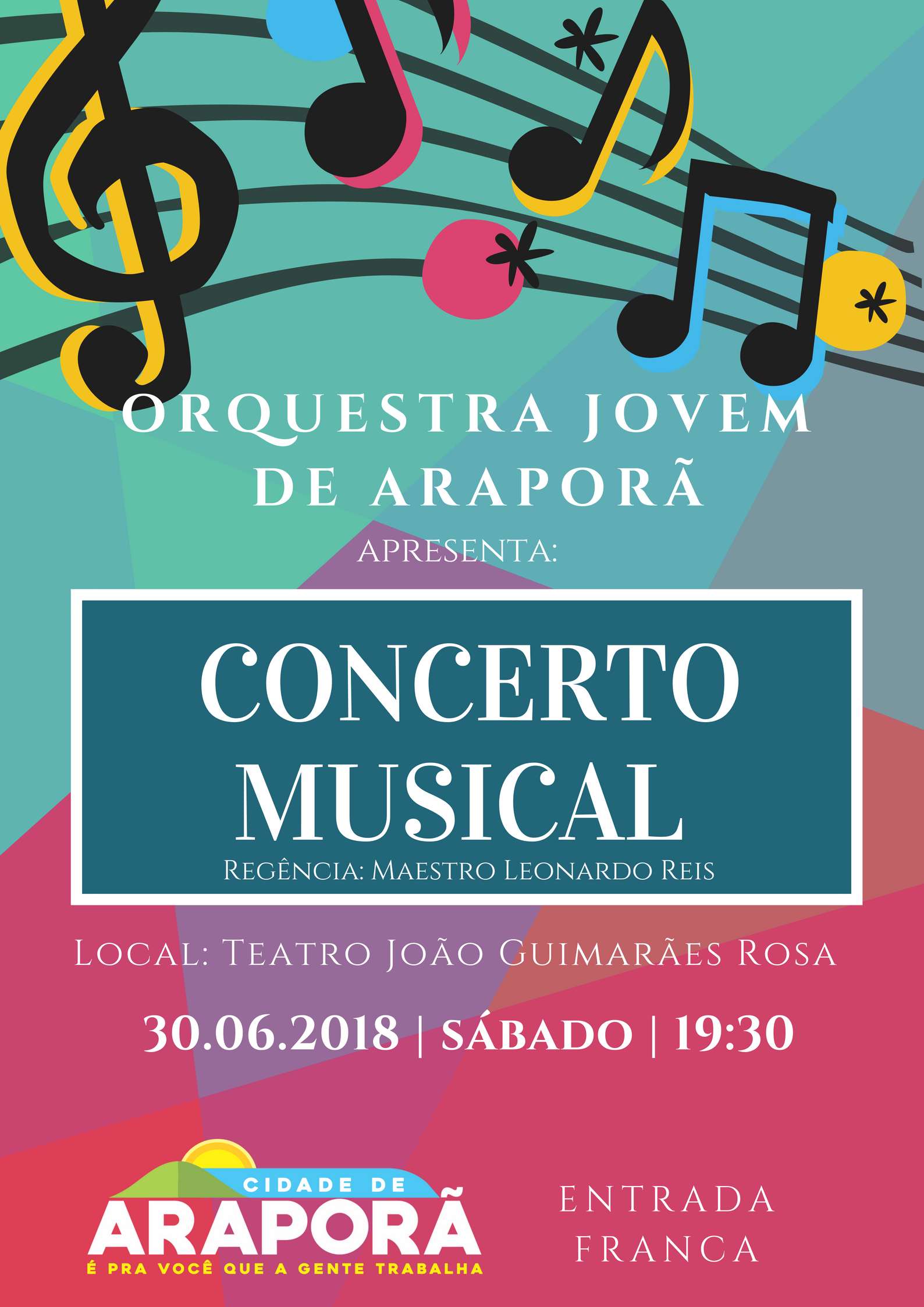 A prefeitura, através da secretaria da Educação e Cultura (SEMEC), Departamento de Cultura e Espaço de Música Ermelindo Ferreira Oliveira, apresenta nesse sábado (30) a Orquestra Jovem de Araporã. A apresentação regida pelo maestro Leonardo Reis vai acontecer no Teatro Municipal João Guimarães Rosa, a partir das 19h30 e será aberta ao público.
