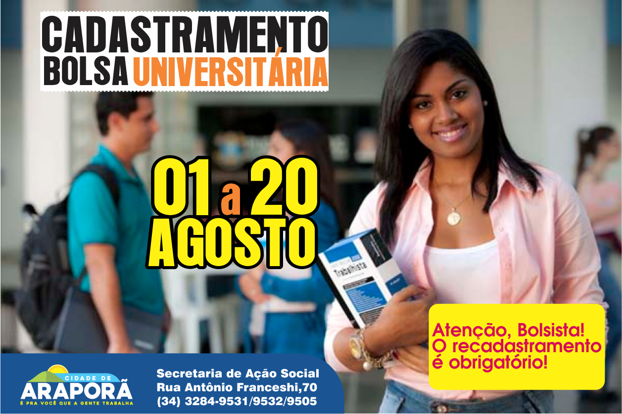 A Prefeitura de Araporã estendeu até o dia 20 de agosto o prazo final para a renovação do cadastro do Programa Bolsa Universitária Municipal. A atualização cadastral é obrigatória para bolsistas e alunos que desejam receber o benefício da bolsa universitária nas modalidades de bolsista ou reembolso. O cadastro é feito pela Secretaria da Ação Social, Habitação e Defesa Civil, localizada na Rua Antônio Franceschi nº 70, no Bairro Alvorada), de segunda a sexta-feira, das 14h às 17h.
