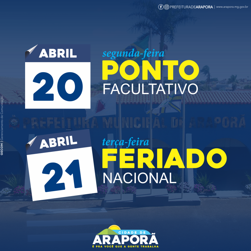Na próxima segunda-feira, dia 20 de abril, véspera do feriado consagrado a Tiradentes, não haverá expediente nos órgãos públicos da Prefeitura de Araporã. Só irão funcionar os serviços essenciais e de interesse público, como plantão de ambulâncias, zelo do patrimônio, coleta de lixo e outros.