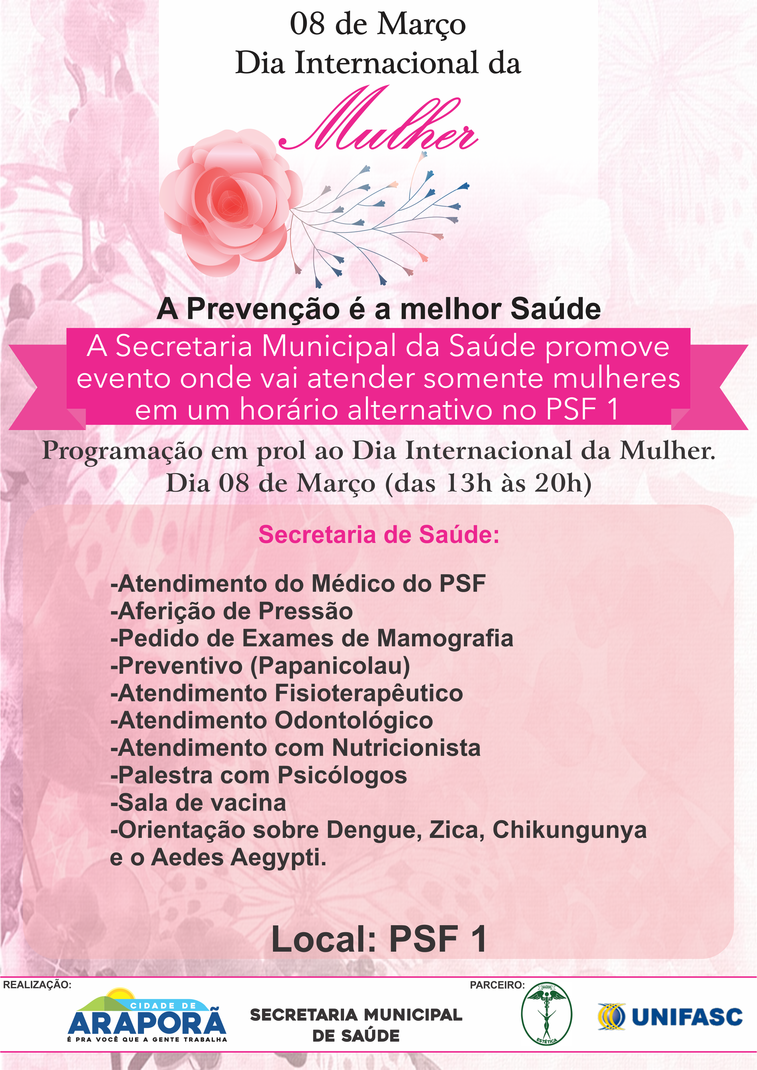 Em parceria com a faculdade UNIFASC das turmas de estética e coméstica proporcionará as munícipes diversos atendimentos na área da saúde e beleza. O evento será realizado no dia 08 de março, no PSF 1, das 13 às 20 horas. O evento é voltado exclusivamente às mulheres araporenses.