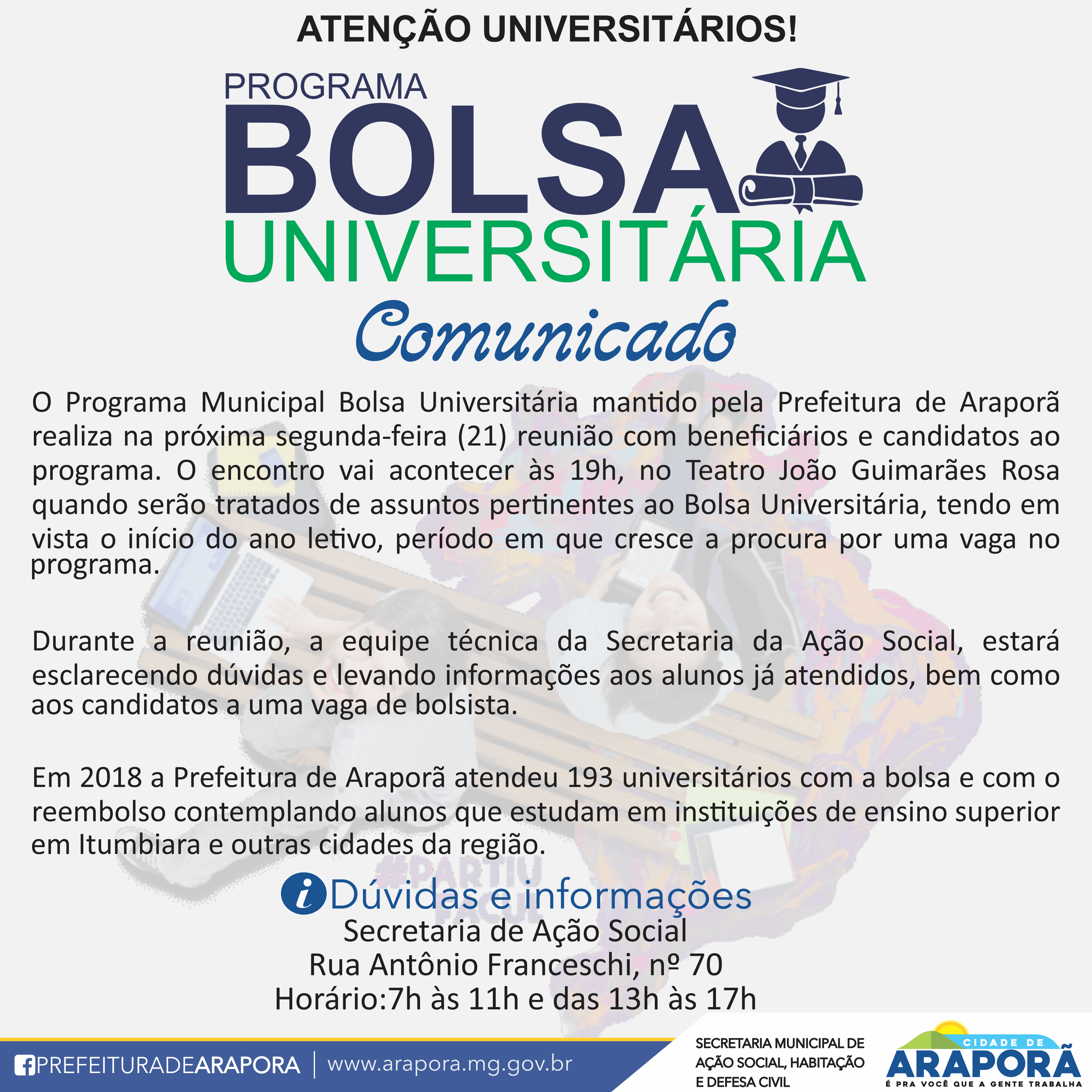 O Programa Municipal Bolsa Universitária mantido pela Prefeitura de Araporã realiza na próxima segunda-feira (21) reunião com beneficiários e candidatos ao programa. O encontro vai acontecer às 19h, no Teatro João Guimarães Rosa quando serão tratados de assuntos pertinentes ao Bolsa Universitária, tendo em vista o início do ano letivo, período em que cresce a procura por uma vaga no programa.
