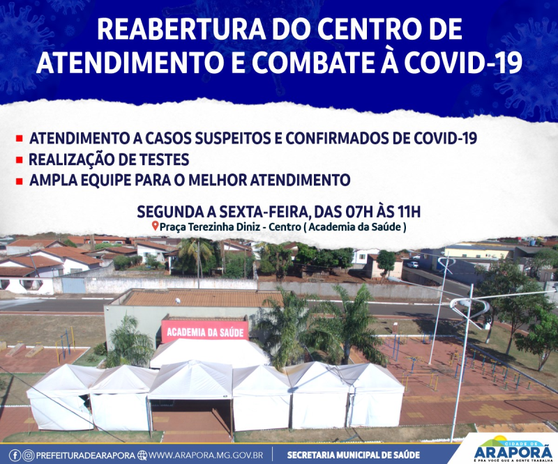Com o objetivo de garantir um atendimento ainda mais direcionado a Covid-19, a Prefeitura de Araporã vai reabrir amanhã, 25, o Centro de Atendimento e Combate a Covid-19. O Local permanecerá o mesmo, no prédio da academia da saúde, localizado na Praça Terezinha Diniz.