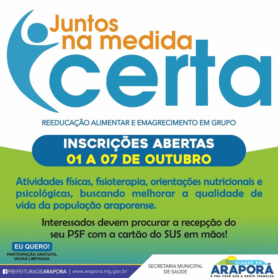 Secretaria Municipal de Saúde, através da equipe do NASF, convida a população de Araporã para participar do Programa Juntos na Medida Certa, que tem como objetivo proporcionar qualidade de vida através da prática de hábitos alimentares saudáveis, atividade física e emagrecimento. As inscrições estão abertas e seguem até o dia 07 de outubro.