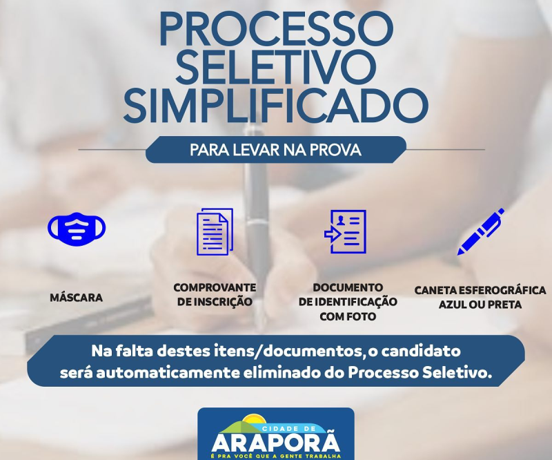 Candidatos deferidos no processo seletivo 001/2021 da Prefeitura de Araporã, realizarão amanhã (02), os testes teóricos. Para realizar a avaliação o candidato deverá seguir as medidas sanitárias e levar todos os documentos necessários.