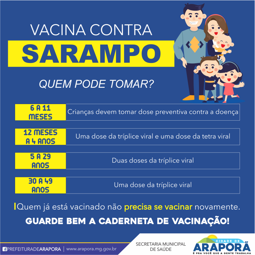A Secretaria da Saúde de Araporã, através da Atenção Básica da Saúde chama a atenção da população para a importância da vacinação. O destaque é para a vacinação contra o sarampo. A doença antes considerada erradicada no país, voltou a assustar. E a vacina é a principal forma de prevenção do sarampo.
