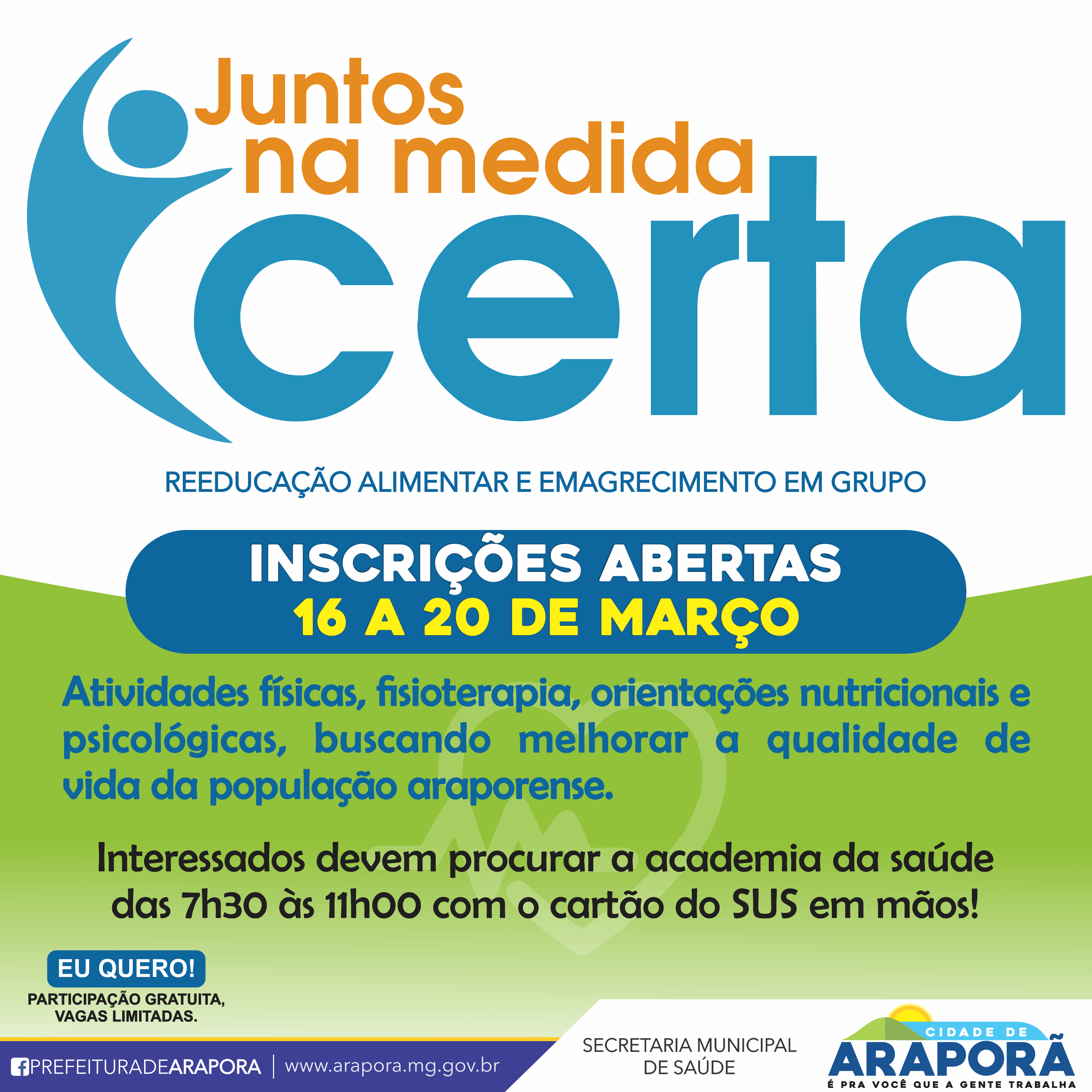 A Secretaria de Saúde de Araporã, através da Atenção Básica dará início a mais uma edição do Projeto Juntos na Medida Certa. Coordenado pelo Núcleo de Apoio à Saúde da Família (Nasf), as inscrições ao projeto vão acontecer entre os dias 16 e 20 de março e devem ser feitas na Academia da Saúde, no horário das 7h30 às 11h. O projeto beneficia todas as pessoas que estejam acima do peso e buscam qualidade de vida com orientação com equipe multidisciplinar. Para isso, o Nasf disponibiliza nutricionista, fisioterapeuta, educador físico e psicólogo.
