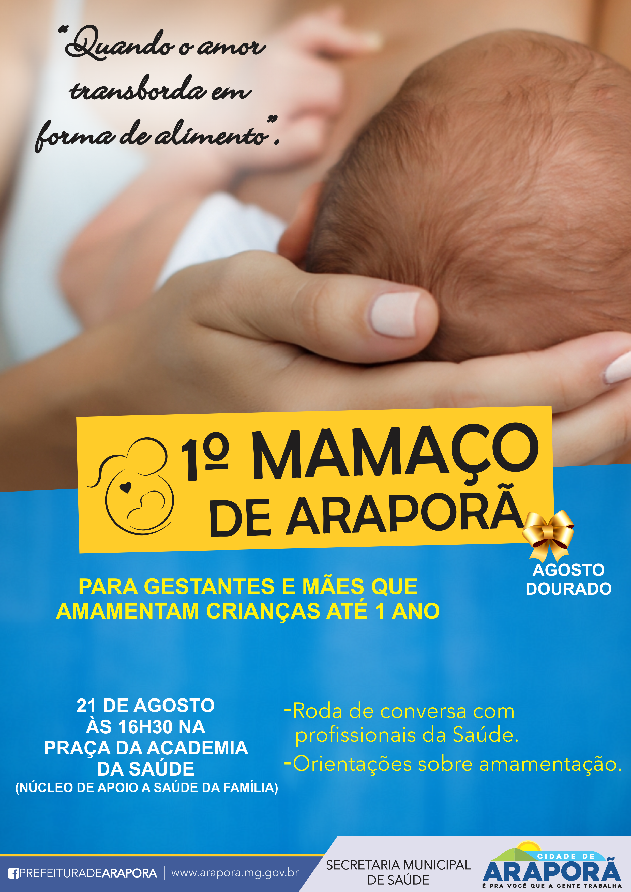 Durante esse mês a Secretaria da Saúde e a Prefeitura de Araporã estão desenvolvendo as ações da Campanha Agosto Dourado que tem como foco a amamentação e a saúde da criança. E será em parceria com o Núcleo de Apoio à Saúde da Família (NASF) que no dia 21 (quarta-feira) vai acontecer a ação “Mamaço”. O evento que faz parte das ações comemorativas à Semana Mundial do Aleitamento Materno vai chamar a atenção da comunidade, especialmente gestantes e futuras mamães, para a importância do aleitamento materno. A ação será concentrada na Praça Terezinha Diniz (Academia da Saúde) a partir das 16h30 e coordenada pelas equipes técnicas do NASF composta por psicólogos, nutricionista, fisioterapeuta e educadora física, e da Secretaria da Saúde.