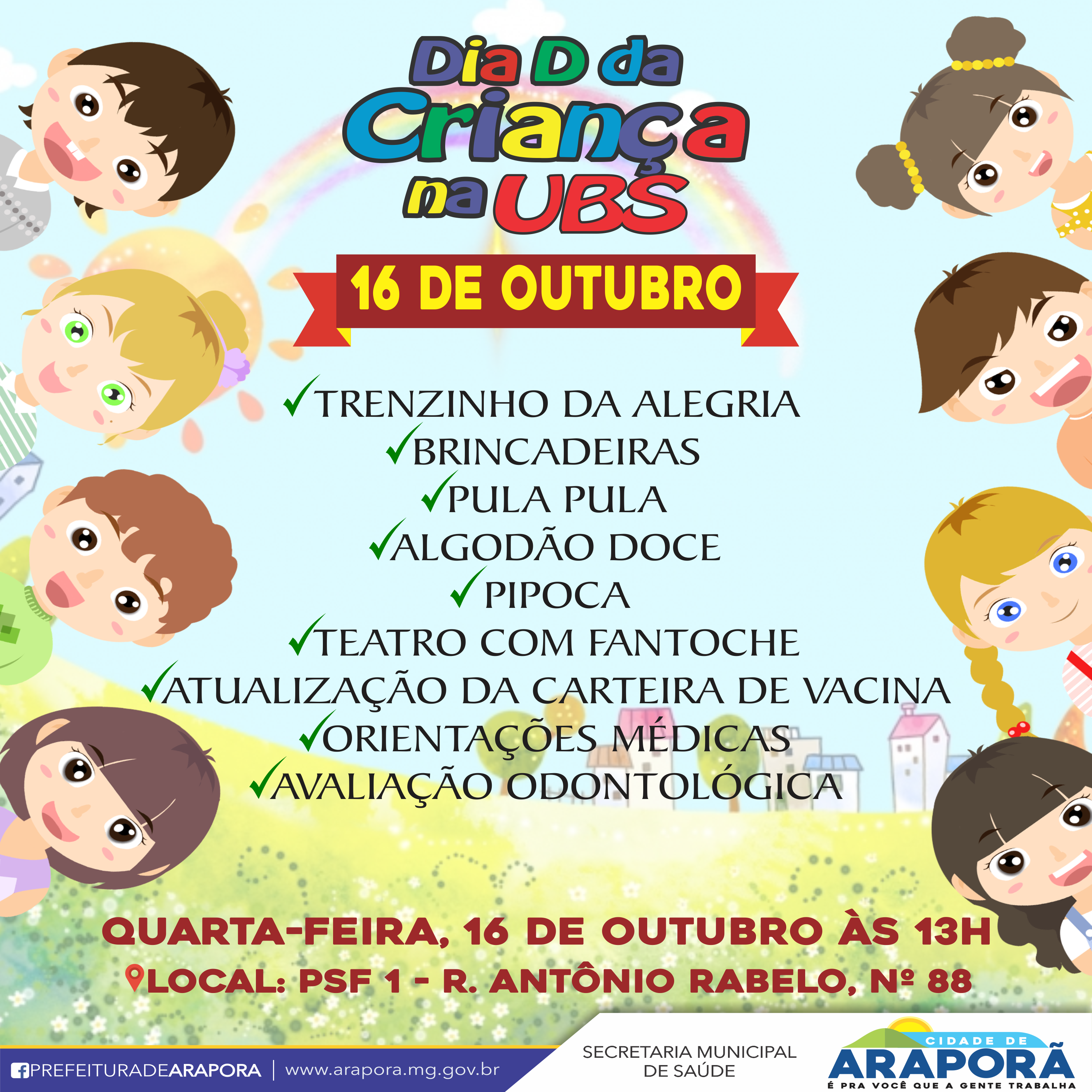 A Prefeitura de Araporã cuida da saúde da população em todas as fases da sua vida. E foi pensando nisso que a Secretaria da Saúde, por meio da Atenção Básica criou o Dia D da Criança na UBS. O evento que vai acontecer no dia 16 de outubro, na UBS do Centro, tem por objetivo comemorar o mês da criança cuidando da sua saúde. Para isso, toda a equipe multidisciplinar da Atenção Básica (médicos, enfermeiros, técnicos, dentistas, psicólogos, nutricionistas, educadores físicos, nutricionistas, ACS’s) vão participar das ações do dia.