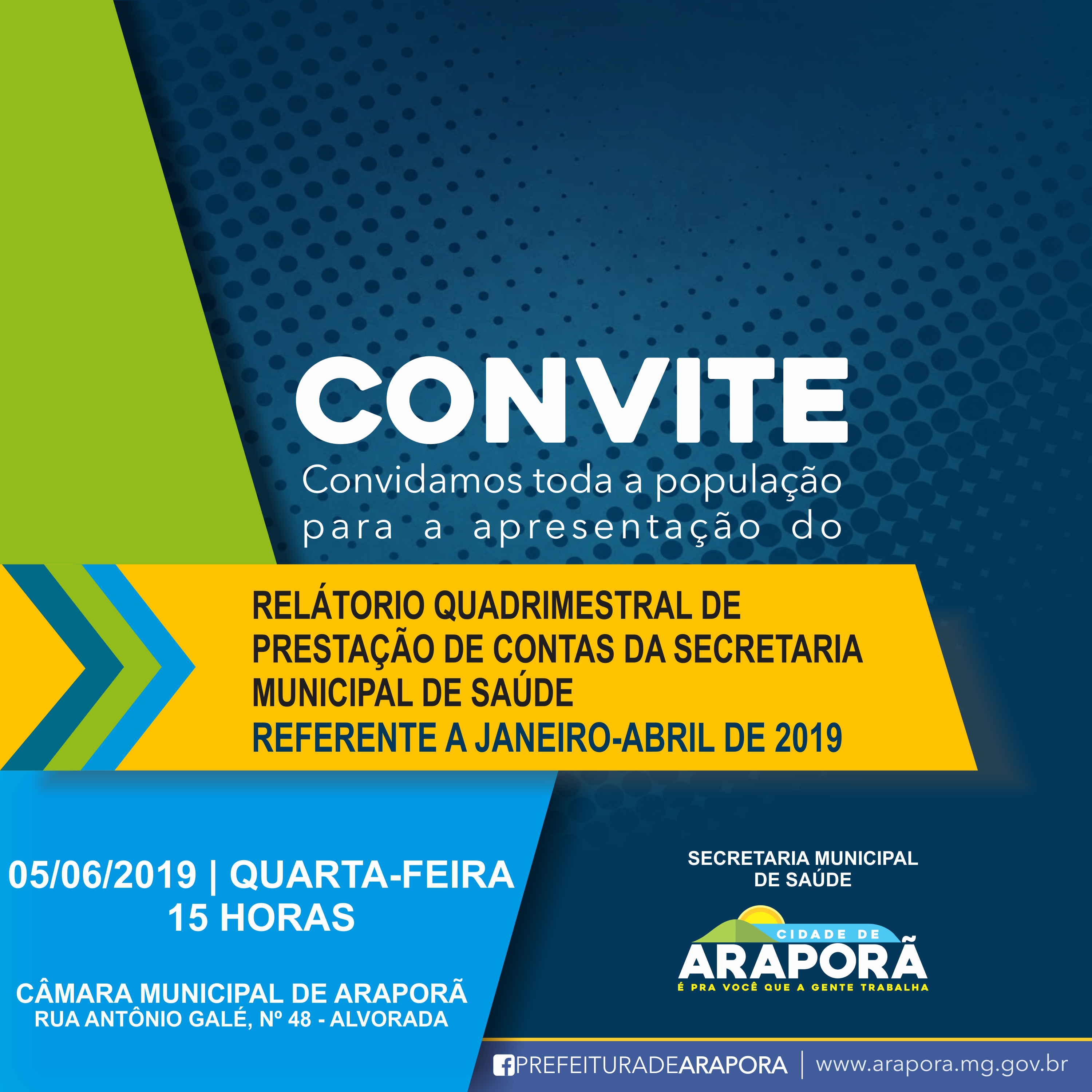 A Secretaria Municipal de Saúde de Araporã convida a população a participar da audiência pública para apresentação do relatório do primeiro quadrimestre de 2019 (janeiro-abril). Aberta ao público, a prestação e contas do setor vai acontecer na quarta-feira (05), no plenário da Câmara de Vereadores, a partir das 15h quando a secretária, técnicos da Secretaria da Saúde e da Prefeitura vão explicaro cumprimento de metas fiscais, o financiamento de ações de saúde, bem como o relatório de produção de serviços da rede assistencial durante os primeiros quatro meses do ano.