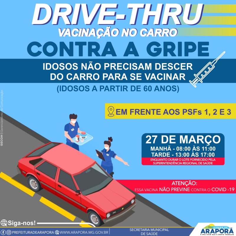 O Ministério da Saúde liberou nessa semana a primeira etapa da Campanha Nacional de Vacinação contra a Gripe (H1N1). Nesse momento, estão sendo vacinados idosos acima de 60 anos e profissionais da área da saúde. E com o objetivo de cumprir as metas da Campanha a Secretaria Municipal de Saúde de Araporã criou um esquema especial de imunização. Nesta sexta-feira (27) a vacinação do público alvo será feita no sistema drive thru. A vacinação será realizada nas portas dos PSFs 1 e 3 (Centro) e 2 (Bairro Alvorada), a partir das 8h.