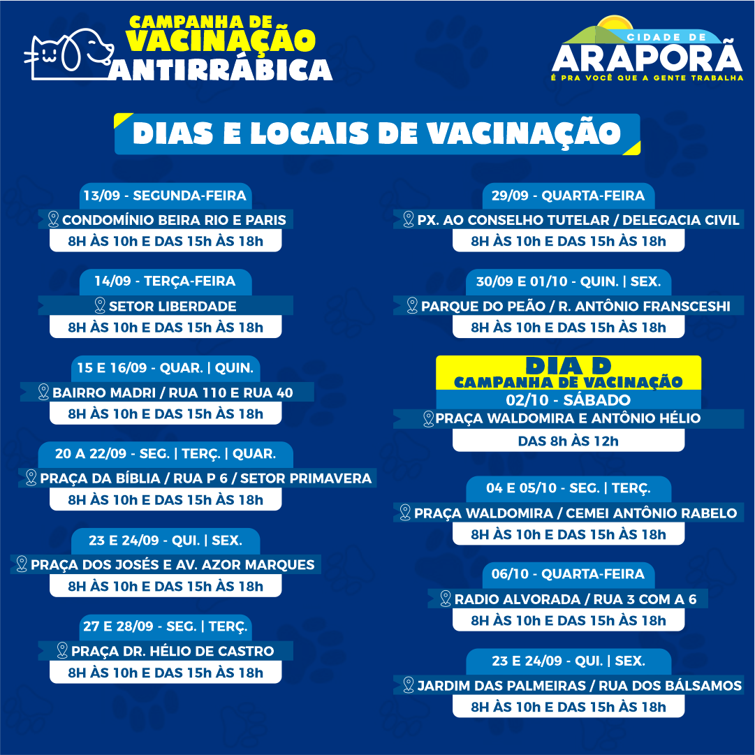 A campanha de vacinação contra a raiva começa hoje, 13, no perímetro urbano. No calendário você confere o dia certo que a campanha estará em seu bairro. Não perca o dia, não deixe o seu melhor amigo com raiva!