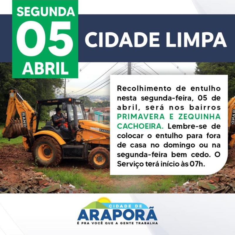Atenção moradores dos bairros Primavera e Zequinha Cachoeira, nesta segunda-feira, 05, será o dia de recolhimento de entulho. Para manter a organização, pedimos que coloquem os materiais em frente à residência no dia programado ou um dia antes. O serviço tem início a partir de 07 horas.