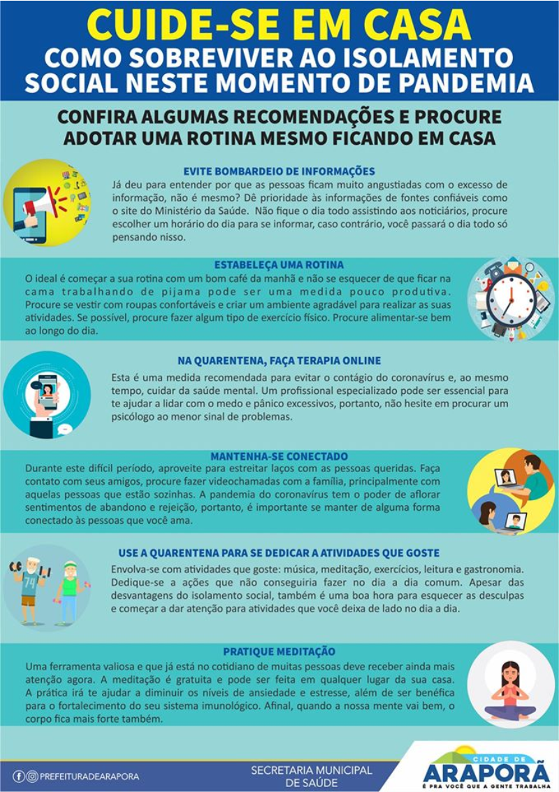 Pensando nisso, o município de Araporã, através da Secretaria da Saúde e da Atenção Básica coloca à disposição da população toda a rede da saúde mental. Os atendimentos psicológicos são ofertados nas três Unidades Básicas de Saúde, onde são realizados, de forma remota (online), e presencial (quando preciso), seguindo as recomendações de segurança sanitária da OMS. É realizado também trabalho de apoio com os profissionais da saúde nas UBS e no Hospital João Paulo II.
