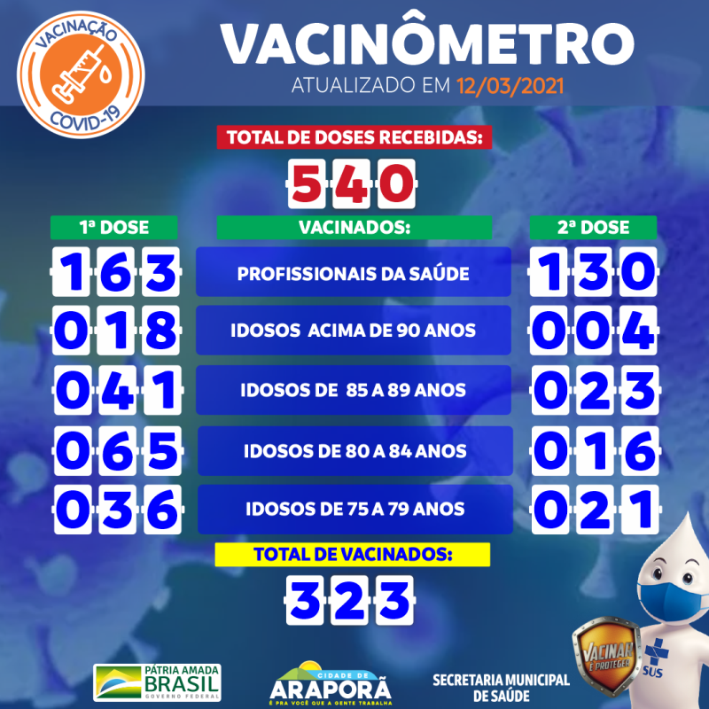 A Secretaria de Saúde disponibiliza a partir de hoje o VACINÔMETRO do município de Araporã. O município já vacinou 323 pessoas, seguindo rigorosamente os grupos prioritários definidos pelos protocolos dos Planos Nacional, Estadual e Municipal de Vacinação.
